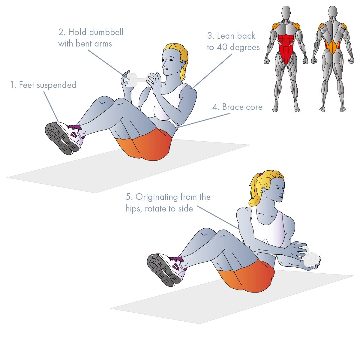این حرکت ترکیبی از اسکوات و چرخش بدن است که علاوه بر تقویت عضلات شکم و پهلو، به پایین‌تنه و بازوها نیز فشار وارد می‌کند.