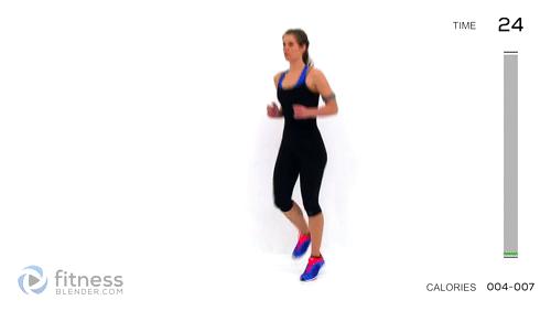 3. برای افزایش شدت، زانوها را بالاتر بیاورید، دست‌ها را تکان دهید یا به جای دویدن در جا، بر روی پنجه پا بپرید.