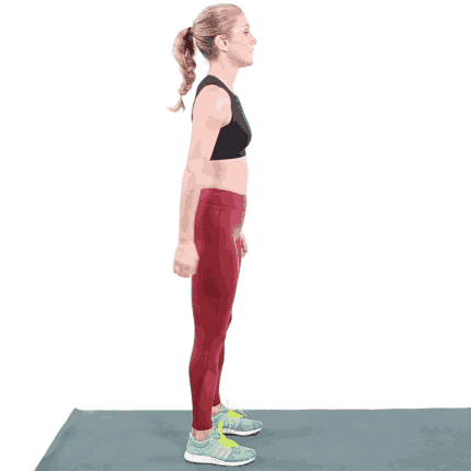 1. به صورت ایستاده شروع کنید، پاها را به هم بچسبانید و دست‌ها در کنار بدن قرار داشته باشند.